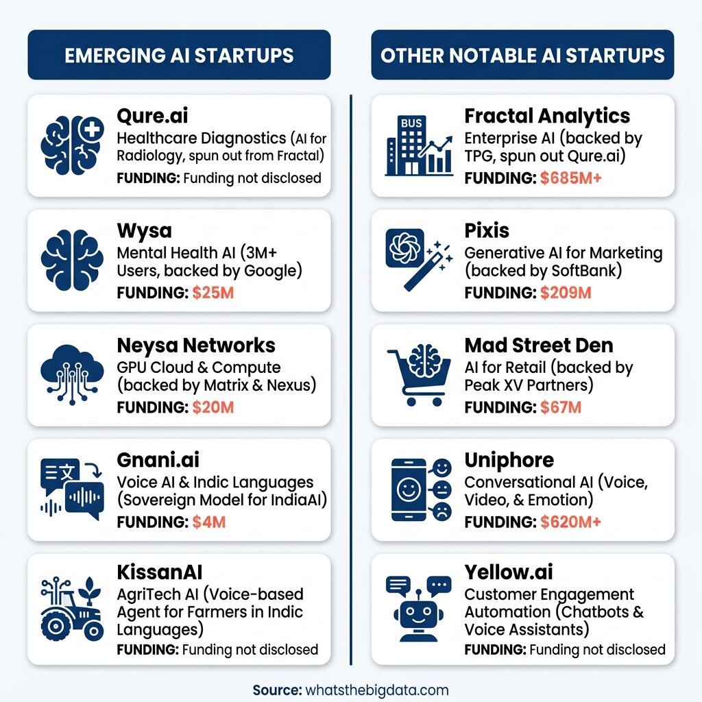 India’s AI startups span a wide range of verticals, with particular strength in enterprise AI, healthcare, fintech, and agriculture.