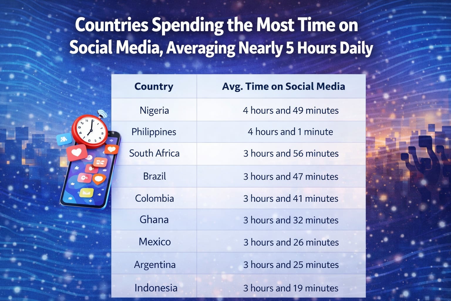 People in Nigeria spend the most time on social media, averaging 4 hours and 49 minutes per day. The Philippines comes next at 4 hours and 1 minute, followed closely by South Africa with 3 hours and 56 minutes daily. Brazil and Colombia also have high usage, with 3 hours and 47 minutes and 3 hours and 41 minutes per day, respectively. Many other countries, including Ghana, Mexico, Kenya, Argentina, and Indonesia, spend more than 3 hours daily on social platforms.