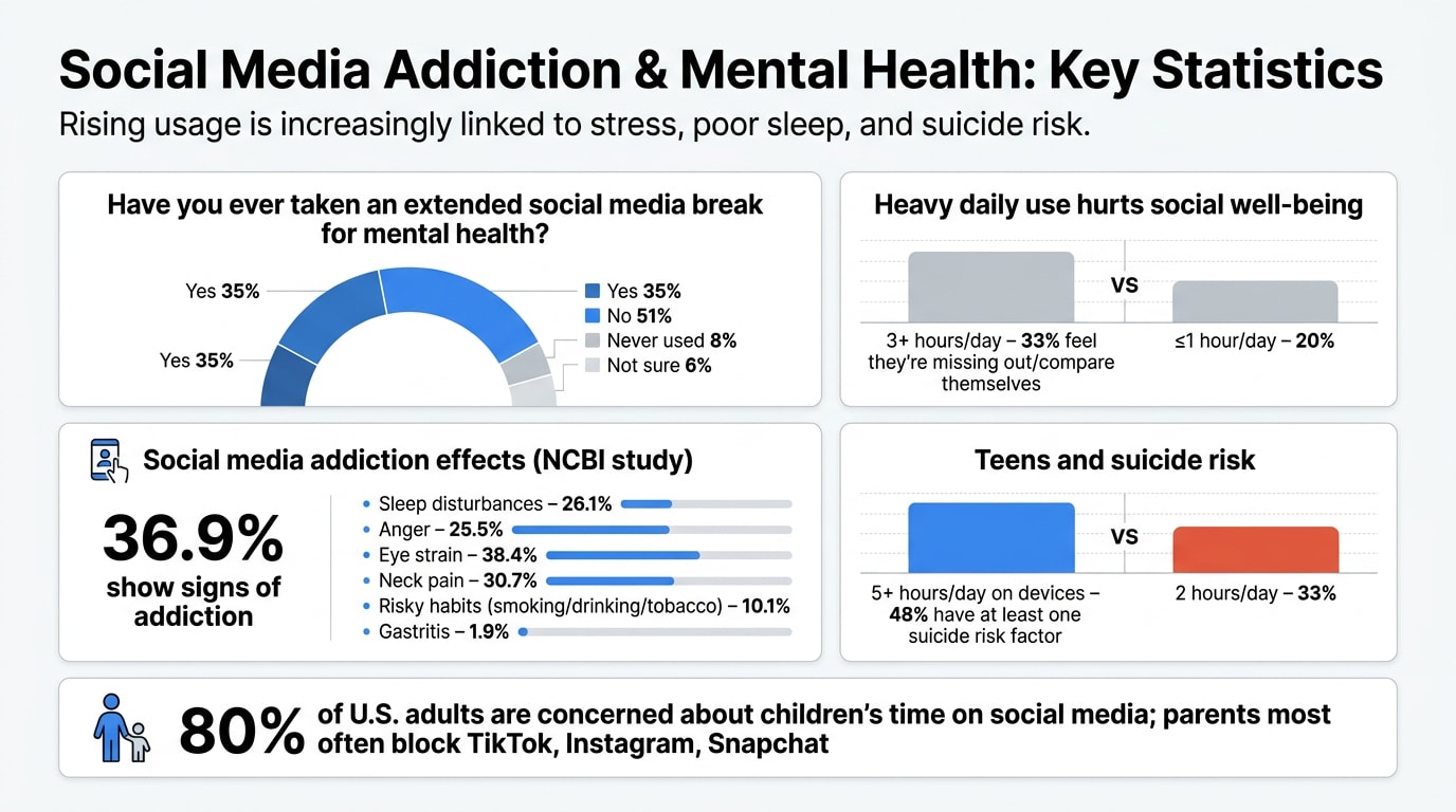 Social media addiction has become a growing concern in today’s digital world, affecting millions of people worldwide. In 2025, there are 5.66 billion social media users, representing 68.7% of the global population. Social media platforms like TikTok, Instagram, Facebook, etc, are designed to keep users engaged, and as a result, people are spending more time scrolling, posting, and interacting online. This constant usage of social media has led to problems like lower productivity, poor sleep, increased anxiety, and lower self-esteem. In this article, we will explore 25 startling social media addiction statistics in 2026, showing how excessive social media use is affecting mental health, daily routines, and the way people connect with others.