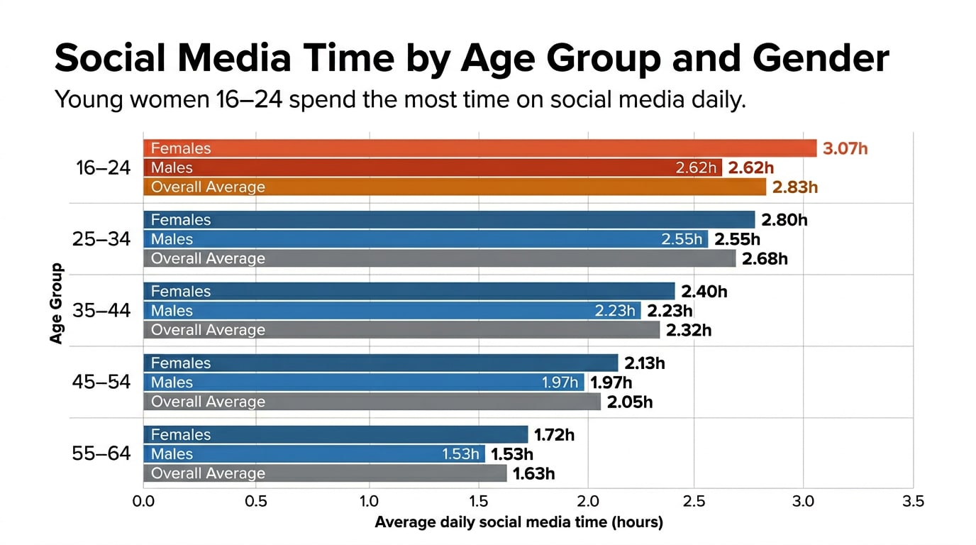Young adults spend more time on social media than any other age group, with 16 to 24 years users leading usage across both genders, according to DataReportal. Females in this bracket spend an average of 3 hours and 4 minutes per day on social platforms, while males spend 2 hours and 37 minutes, resulting in an overall average of 2 hours and 50 minutes.