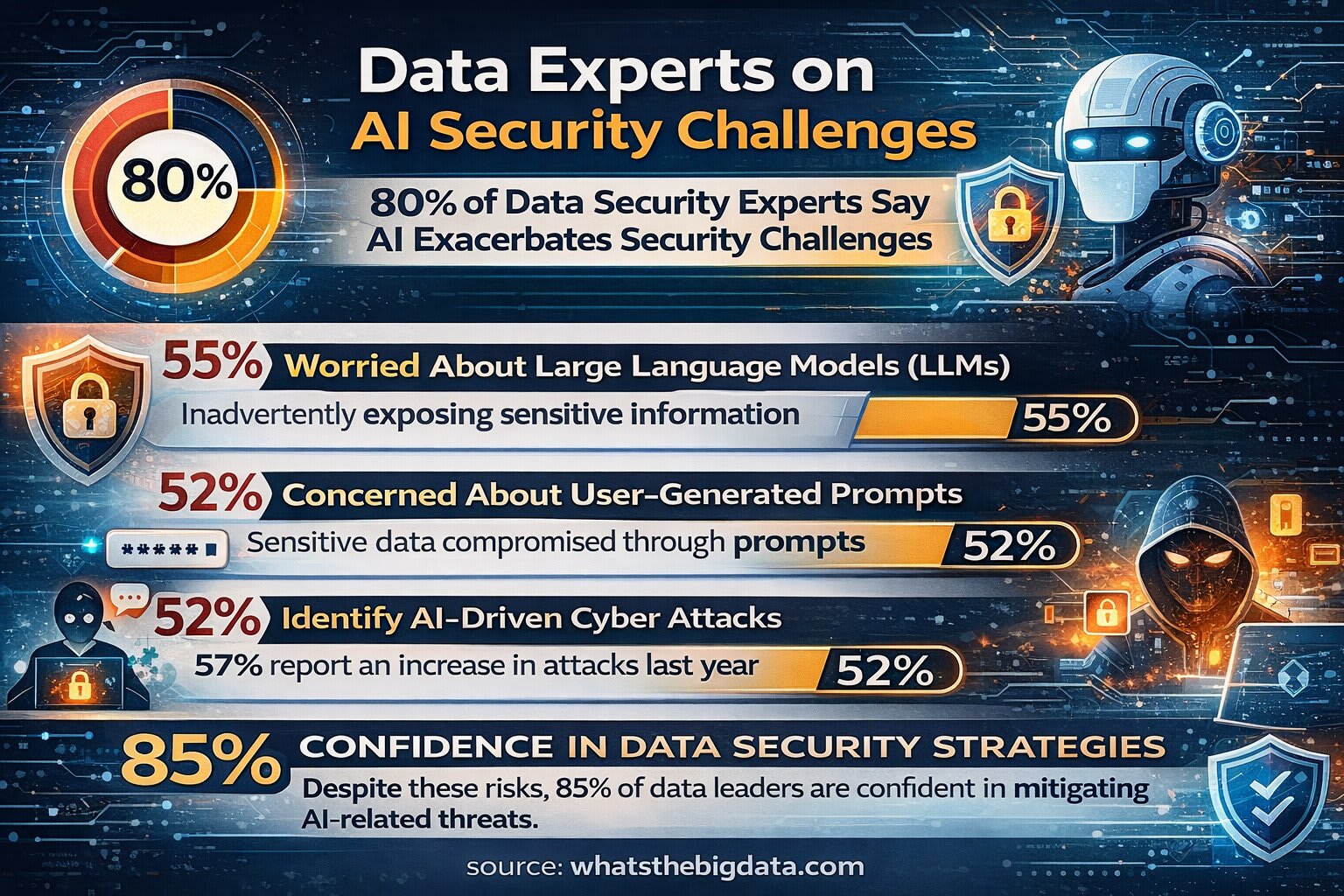 52% identify AI-driven attacks by threat actors as a significant threat, with 57% reporting an uptick in such attacks over the past year.