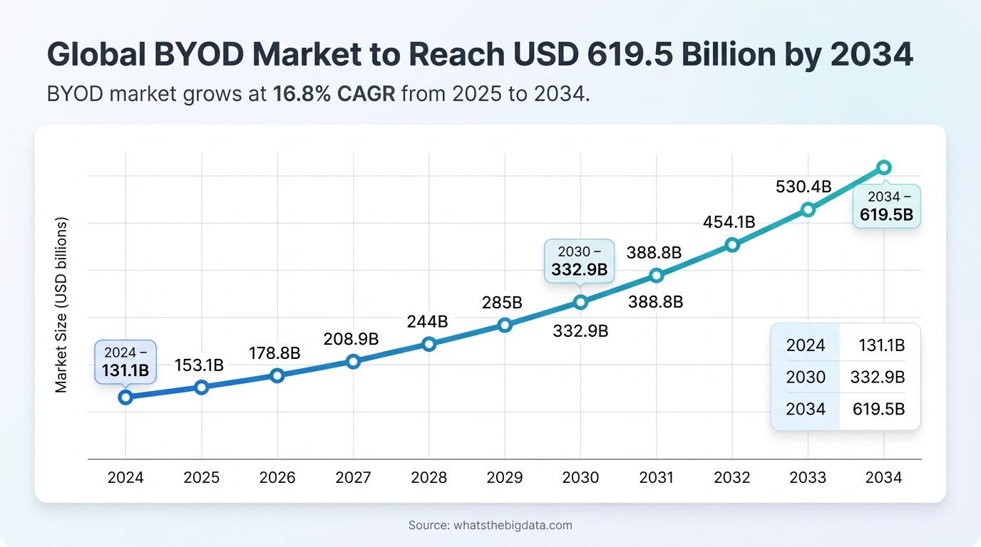 Nearly half of organizations (48%) have experienced data breaches connected to unsecured personal devices, highlighting the security risks associated with BYOD. Recent reports from late 2024 and 2025 indicate that unmanaged employee devices are a major vulnerability, particularly as remote and hybrid work models increase reliance on personal technology.