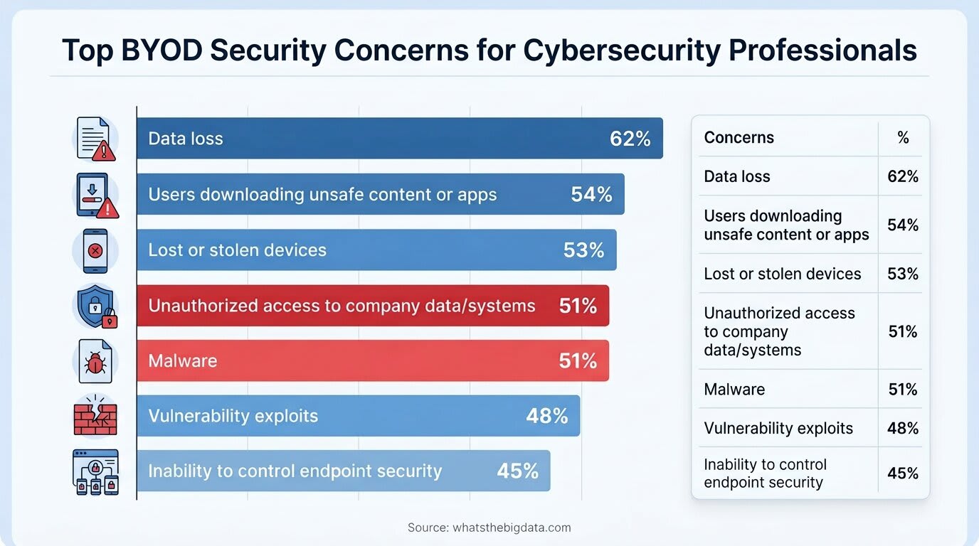 Data loss is the leading security concern for BYOD, with 62% of cybersecurity professionals identifying it as their top worry. Other major BYOD-related risks include users downloading unsafe content or apps (54%), lost or stolen devices (53%), unauthorized access to company data and systems (51%), malware infections (51%), vulnerability exploits (48%), and challenges in controlling endpoint security (45%).