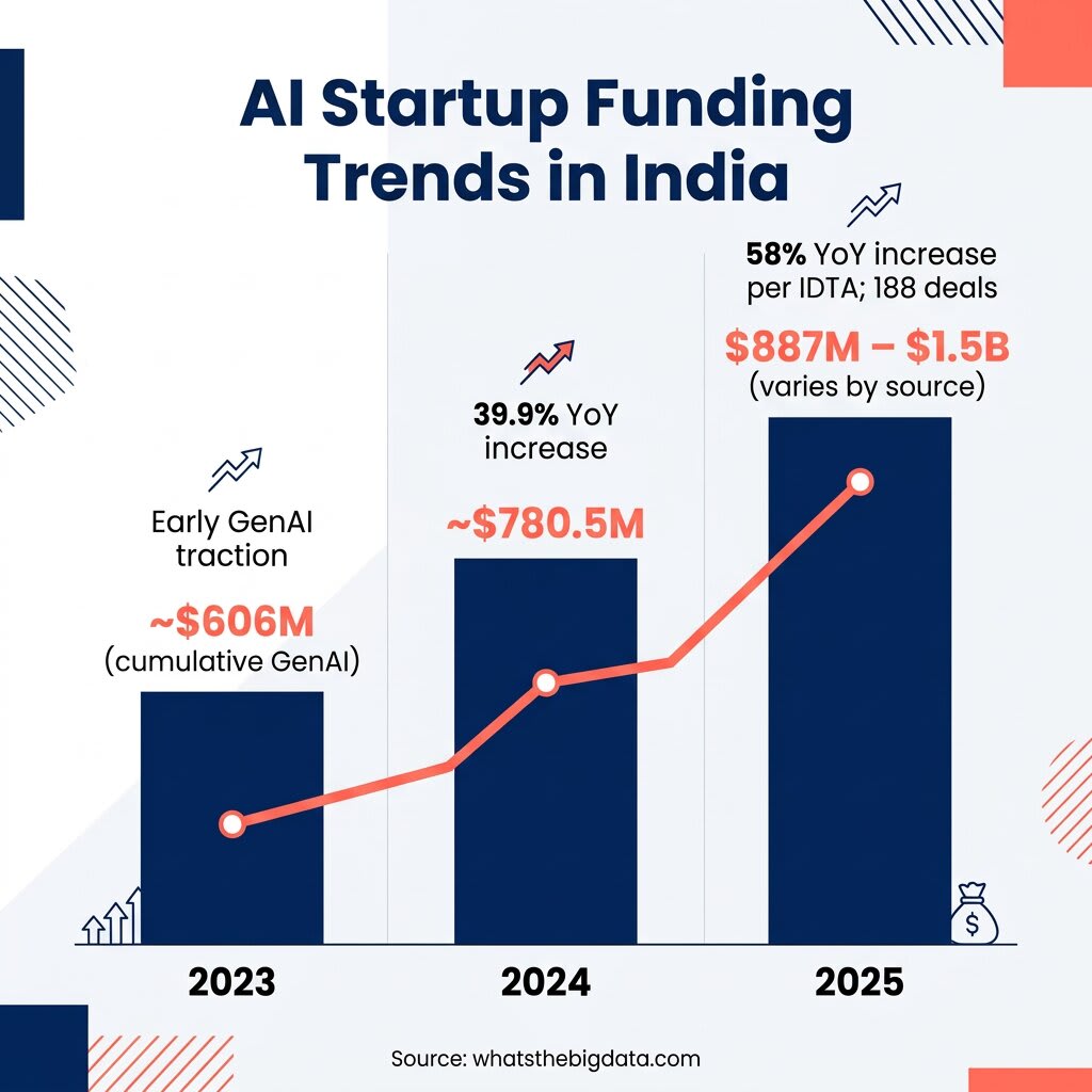 The India Deep Tech Alliance (IDTA) report found AI funding rose 58% YoY in 2025, with 188 deals totaling $1.22 billion. Forbes India tracked $887 million across the 2018–2026 period for 2025 specifically. AI’s share of total VC funding in India rose from ~4.5% in 2020 to ~12.3% in 2025.