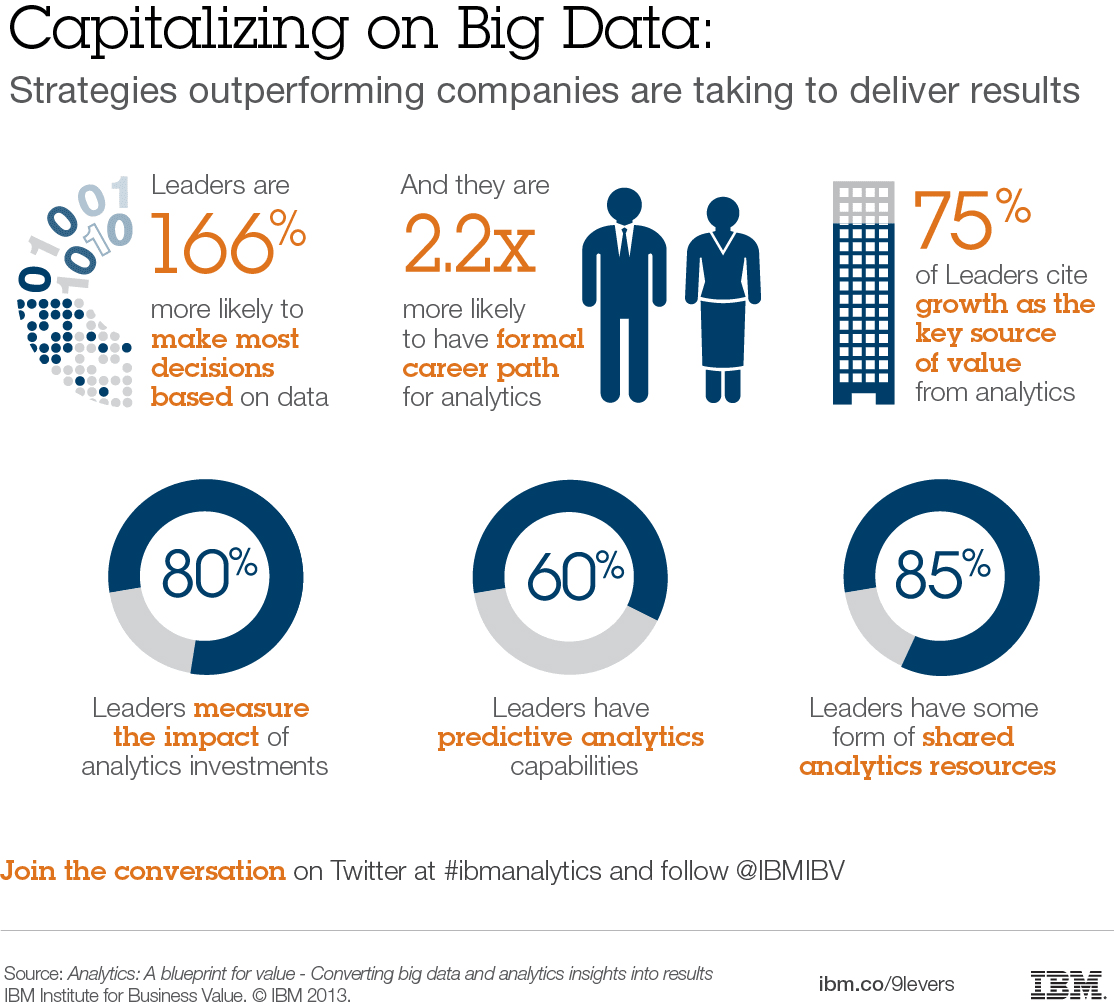 The IBM Institute for Business Value’s 2013 analytics survey surveyed 900 business and IT executives from 70 countries. “Leaders” (19% of the sample) were respondents self identified as “substantially outperforming their market or industry peers” in a question used by the IBM Institute for Business Value for years across a wide variety of surveys.